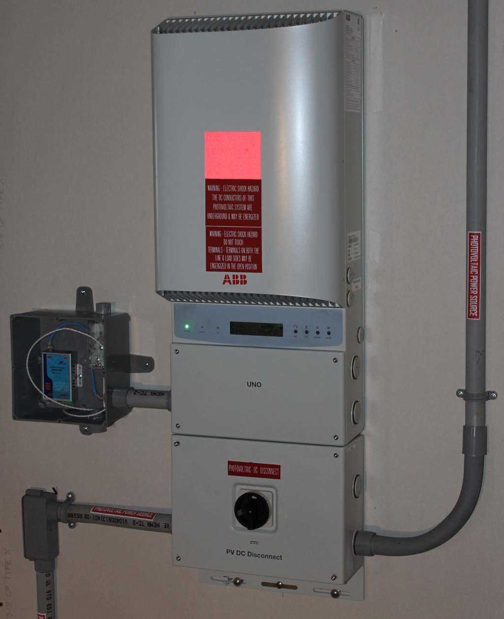 The inverter is an ABB PVI-6000-OUTD-US-A. This is a transformer-less inverter rated at 6Kw. It provides 240 volts to the grid when operating. The inverter manufacturer was formerly Power One. This caused me some difficulty when looking for the users manual and monitoring software online as many of the web pages are still under the Power One name.